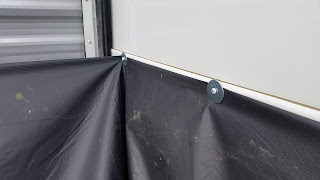 Today we worked hard on getting the skirting around the RV. The temperatures are really nice now and we want to get Millie ready for winter before it gets cold outside. Brian bought an old billboard sign tarp and we cut it in pieces. He then used the existing screws on the trailer to hang it all around. It looks great. I think it really dresses her up. Next up we will be building a small deck at our front door. Hopefully that will help the shoe situation around here. We always have a pile of shoes by our front door and it drives me crazy. I hope to get a box on the porch we can drop them in.